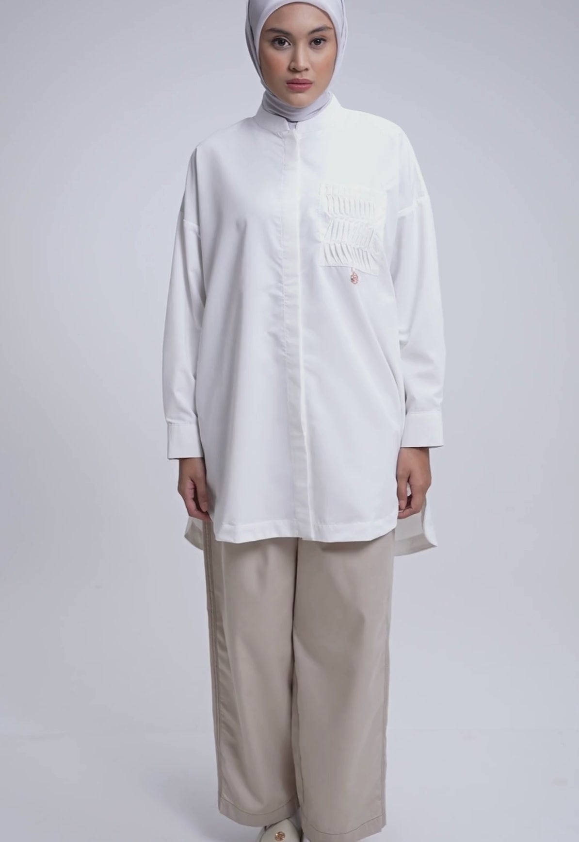 The Ilya Tunic from the RiaMiranda Mall Collection combines elegance with comfort, crafted from creamy sateen fabric for a smooth, luxurious feel. This free-size white tunic features a subtle buckle logogram detail, adding a refined touch to its minimalist design. Equipped with hidden buttons, it offers a seamless look while ensuring ease of wear, making it a versatile addition to any wardrobe.