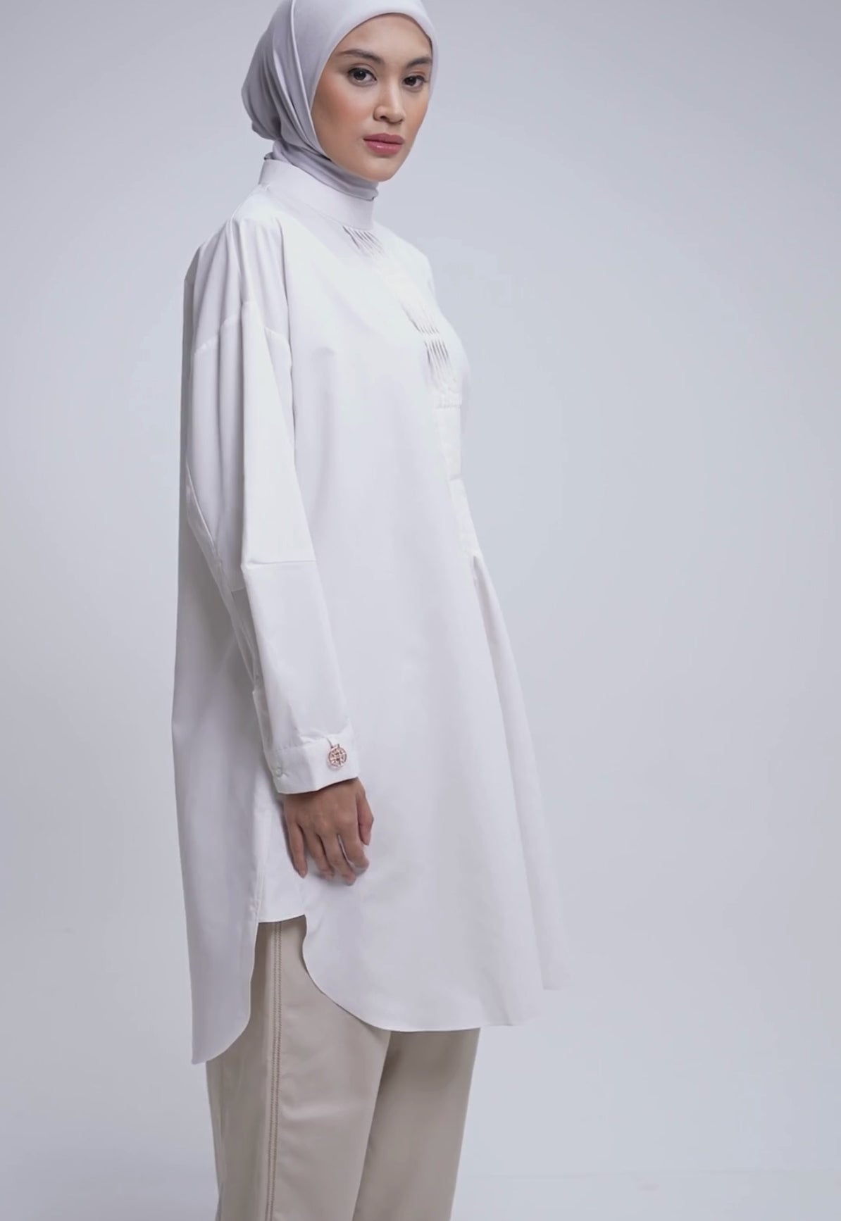 The Poiree Tunic from RiaMiranda’s Special Mall collection combines elegant design with comfortable wear. Crafted from creamy sateen material, it offers a smooth texture and subtle sheen. Featuring a drop shoulder silhouette for relaxed fit, this white tunic is available in sizes S-M and L-XL. A distinctive buckle logogram detail adds a refined brand signature, making it a sophisticated choice for versatile styling.